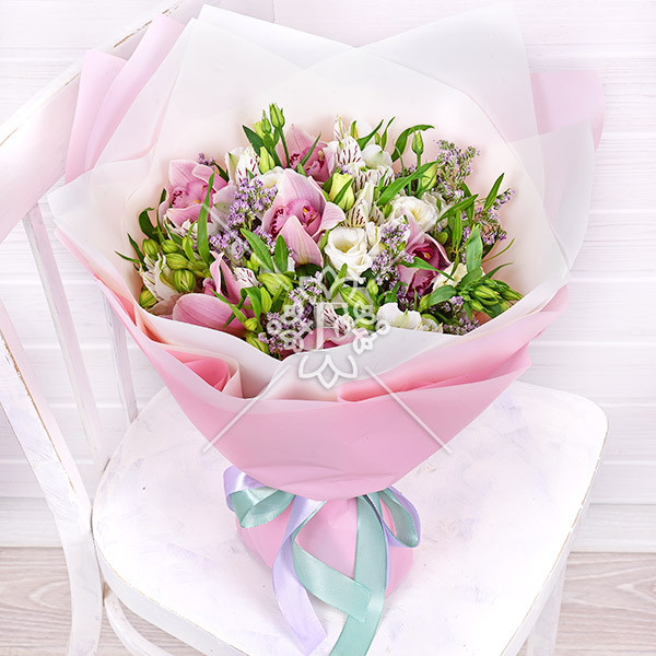 орхидея сиреневая – 3 шт., эустома белая – 2 шт., альстромерия белая – 2 шт., зелень декоративная (лимониум фиолетовый, фисташка), упаковка, лента.